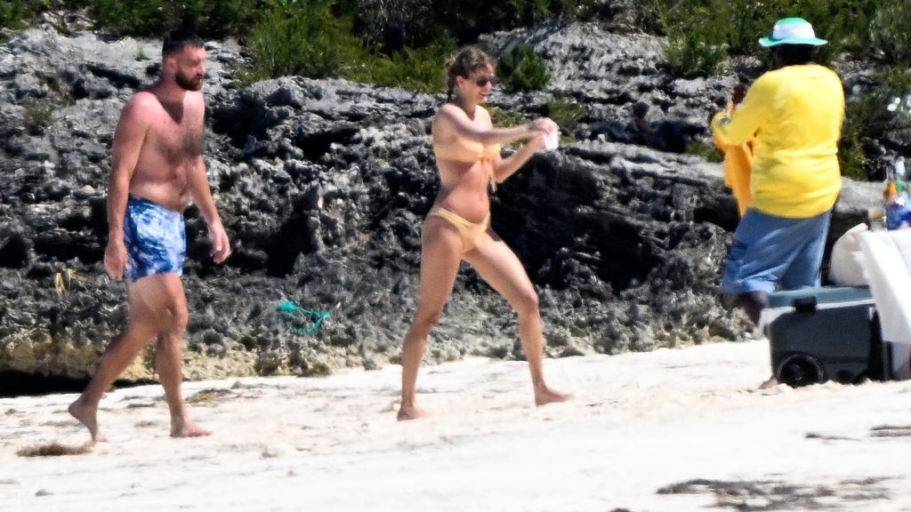 Swift a fost fotografiată într-un bikini galben, în timp ce Kelce a rămas fără tricou, în costume de baie cu modele albastre, în timp ce se bucurau de distracție la soare pe Harbor Island, marți, în imagini obținute de Fox News Digital.