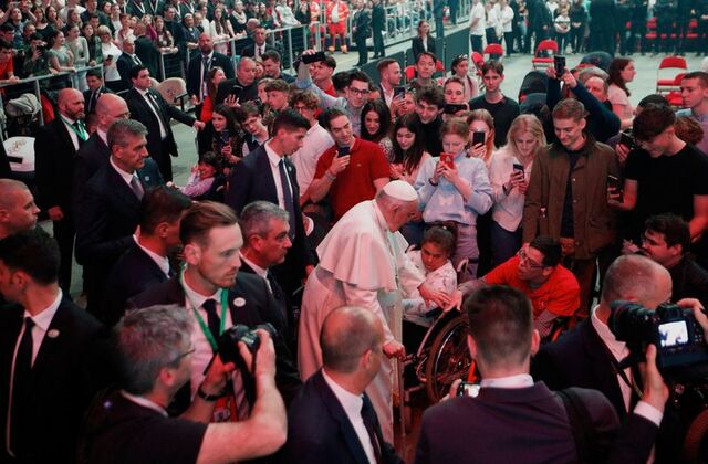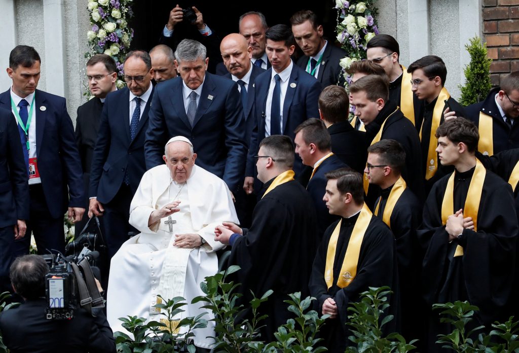 Papa Francisc a primit o serenadă de la o trupă de romi maghiari care cântau, purtând haine cu motive florale, și a părut să se bucure de muzică în timp ce aceștia se învârteau în jurul său, în timp ce stătea în scaunul său cu rotile. însă ceea ce a auzit Francisc mai devreme a fost mult mai sobru. Oleg Yakovlev a povestit că el, soția sa Lyudmila și cei cinci copii ai lor au fost nevoiți să părăsească Dnipro în urmă cu un an, în urma bombardamentelor rusești.